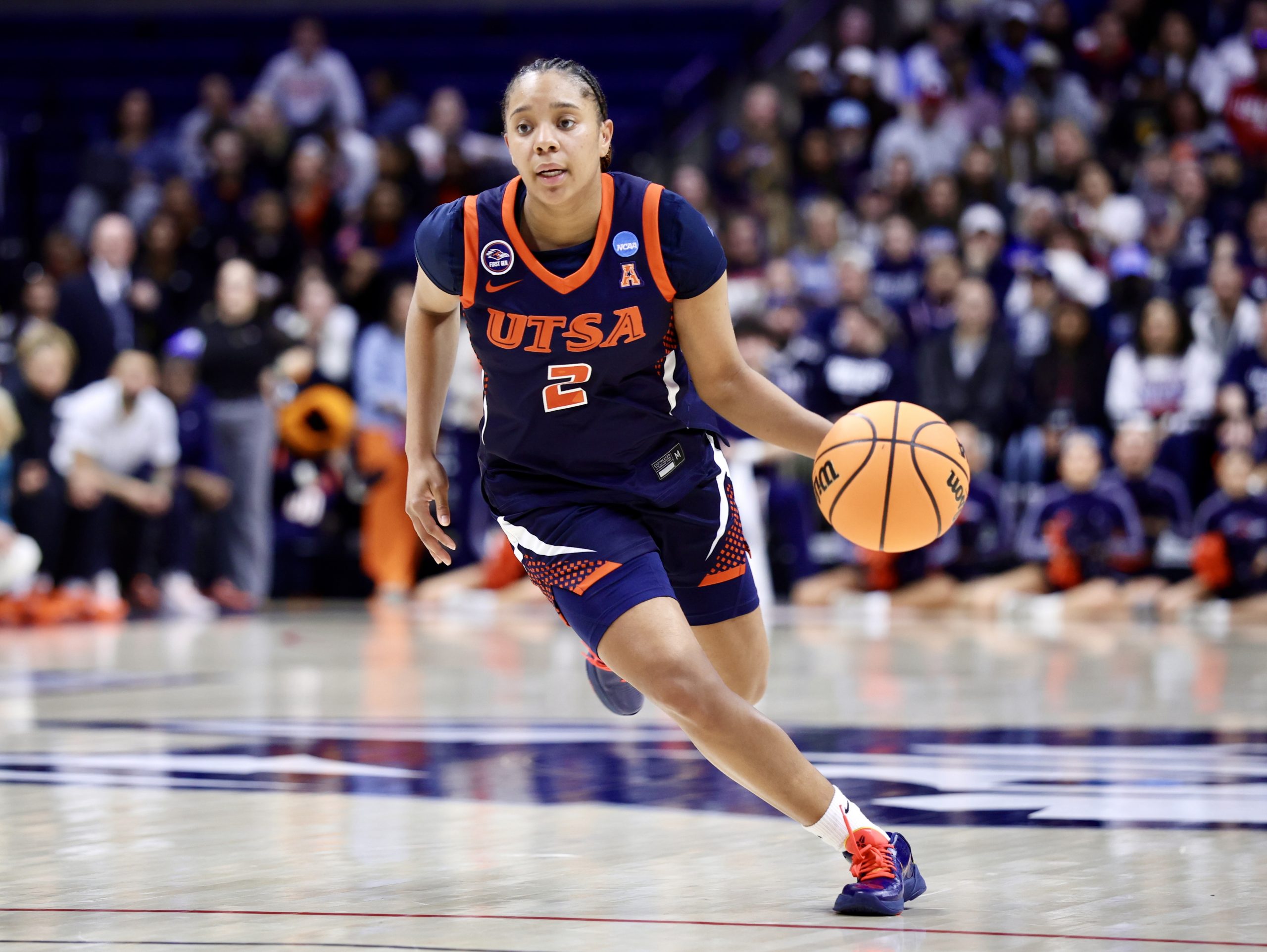 UTSA point guard Ereauna Hardaway pushes the ball up court against Connecticut in the NCAA tournament. UConn advanced with a 90-52, first-round victory on their home court in Storrs. Hardaway finished with 11 points, four rebounds and four assists. – Photo by Denise DePiero, courtesy of UTSA athletics