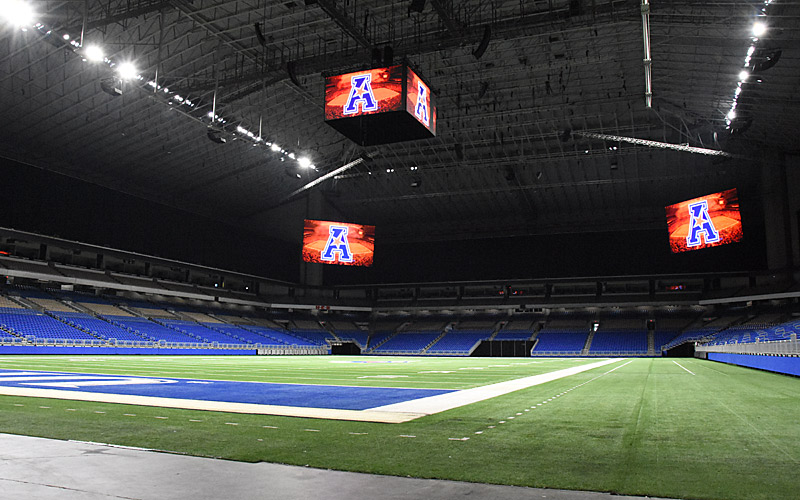 American Athletic Conference commissioner Mike Aresco and UTSA athletics director Lisa Campos talked to the media on Wednesday, July 19, 2023, at the Alamodome. – Photo by Joe Alexander