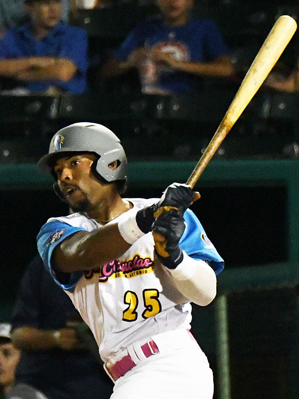 Ian Bailey drives in the Flying Chanclas’ first two runs of the game with a double over third base in the bottom of the sixth inning against Brazos Valley on Tuesday at Wolff Stadium. – photo by Joe Alexander