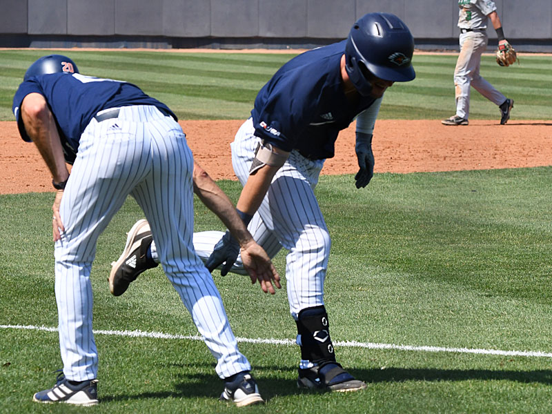UTSA’s Chase Keng (right) is congratulated by third base coach Patt Hallmark after hitting a three-run homer in the sixth inning. Marshall beat UTSA 9-6 in Conference USA baseball on Saturday, May 7, 2022, at Roadrunner Field. – photo by Joe Alexander
