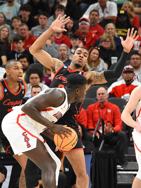 Houston’s Reggie Chaney guarding Arizona’s Oumar Ballo. No. 5 seed Houston upset No. 1 seed Arizona 72-60 in the NCAA tournament South Region Sweet 16 on Thursday, March 24, 2022, at the AT&T Center. – photo by Joe Alexander
