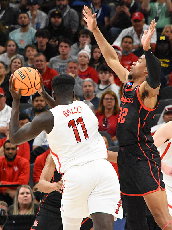 Houston’s Reggie Chaney guarding Arizona’s Oumar Ballo. No. 5 seed Houston upset No. 1 seed Arizona 72-60 in the NCAA tournament South Region Sweet 16 on Thursday, March 24, 2022, at the AT&T Center. – photo by Joe Alexander