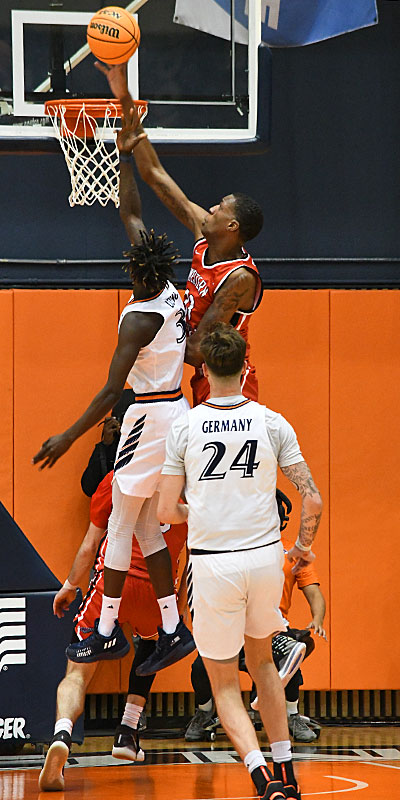 Western Kentucky’s Jamarion Sharp blocking a shot against UTSA in Conference USA men’s basketball on Saturday, Feb. 12, 2022, at the Convocation Center. – photo by Joe Alexander