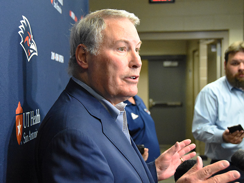 American Athletic Conference commissioner Mike Aresco and UTSA athletics director Lisa Campos talked to the media on Wednesday, July 19, 2023, at the Alamodome. – Photo by Joe Alexander