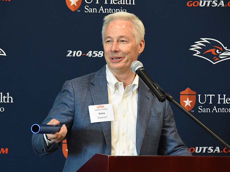 Roadrunner Foundation President Gene Dawson at the grand opening celebration of the UTSA Park West Fieldhouse facility in front of the school’s soccer and track and field stadiums. – Photo by Joe Alexander