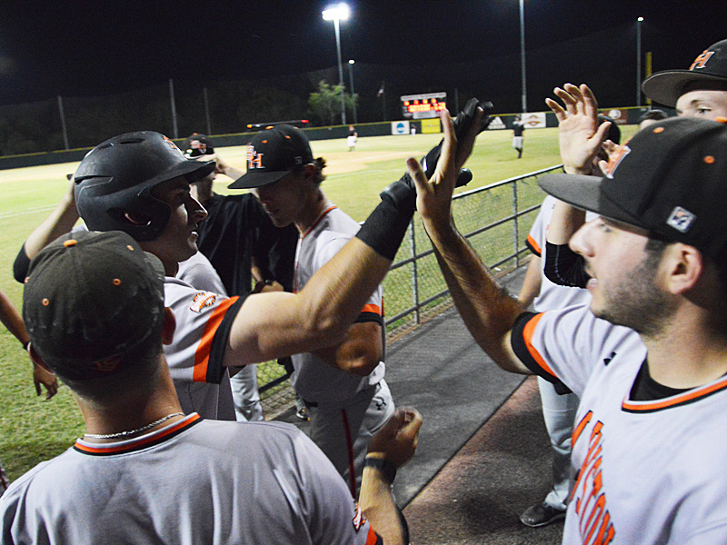 Sam Houston State’s Hunter Hearn (left) celebrates with teammates after hitting a solo home run in the top of the 10th inning. That was the winning run in Sam Houston State’s 5-4 victory over Incarnate Word on Thursday night in San Antonio. Sam Houston State clinched the outright Southland Conference title. – photo by Joe Alexander
