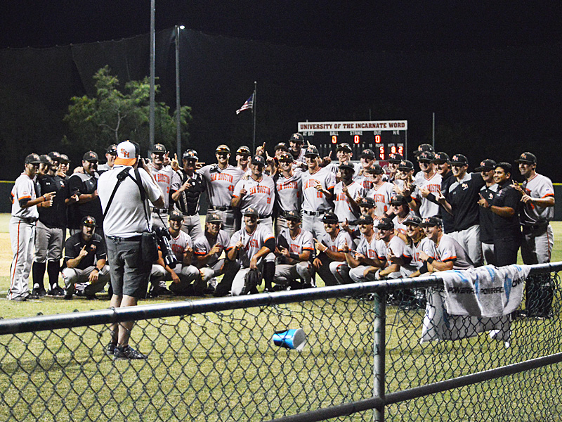 Sam Houston State poses for a team photo after its 5-4 victory over Incarnate Word in 10 innings on Thursday night in San Antonio. Sam Houston State clinched the outright Southland Conference title. – photo by Joe Alexander