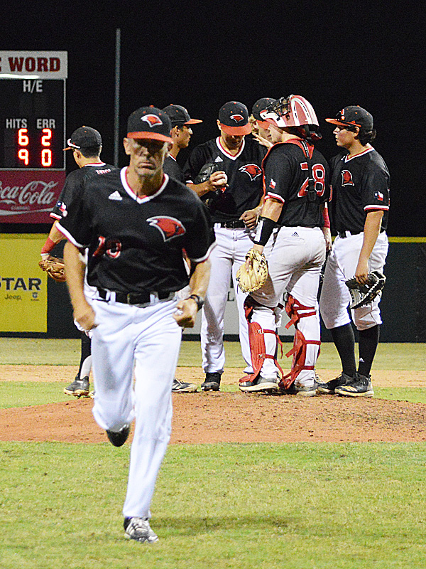 Incarnate Word coach Patrick Hallmark returns to the dugout following a pitching change during Thursday night’s game against Sam Houston State. – photo by Joe Alexander