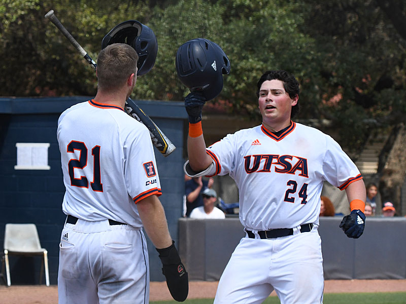 Ryan Flores home run. UTSA beat UAB 12-2 on Saturday, May 21, 2022, at Roadrunner Field in the final game of the Conference USA baseball regular season. – photo by Joe Alexander
