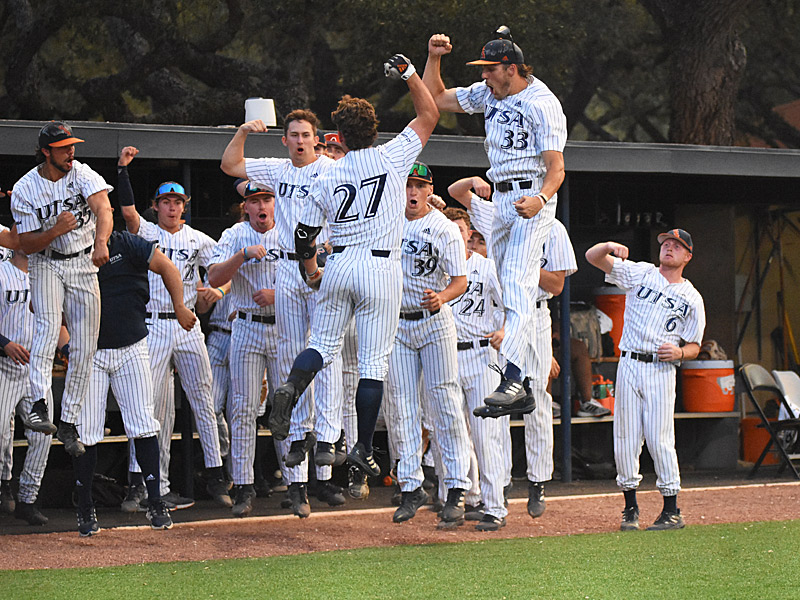 Taylor Smith (27) and the Roadrunners do the BOOM celebration after Smith’s home run in the seventh inning. UTSA scored four runs in the seventh inning to rally past Rice 9-7 in Conference USA baseball on Friday, May 5, 2023, at Roadrunner Field. – Photo by Joe Alexander