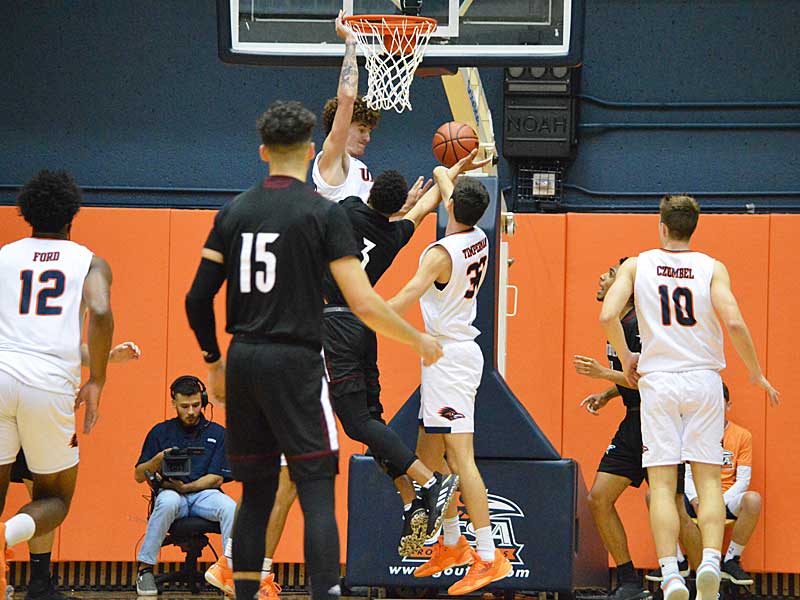 UTSA’s Phoenix Ford (12), Jacob Germany (24), Austin Timperman (32) and Eric Czumbel (10). The Roadrunners beat Texas A&M International 89-60 in an exhibition game on Wednesday, Oct. 30. 2019 at the UTSA Convocation Center. – photo by Joe Alexander