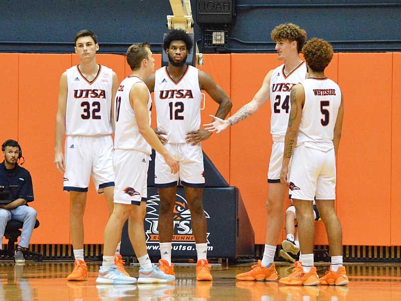 UTSA’s Austin Timperman (32), Eric Czumbel (10), Phoenix Ford (12), Jacob Germany (24) and Makani Whiteside (5). The Roadrunners beat Texas A&M International 89-60 in an exhibition game on Wednesday, Oct. 30. 2019 at the UTSA Convocation Center. – photo by Joe Alexander