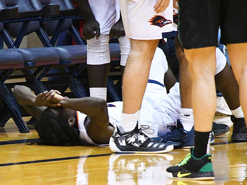 UTSA’s Keaton Wallace left the game late Thursday against Marshall after diving for a loose ball and hitting the ground hard. It appeared he might have hit one of the courtside chairs. – photo by Joe Alexander