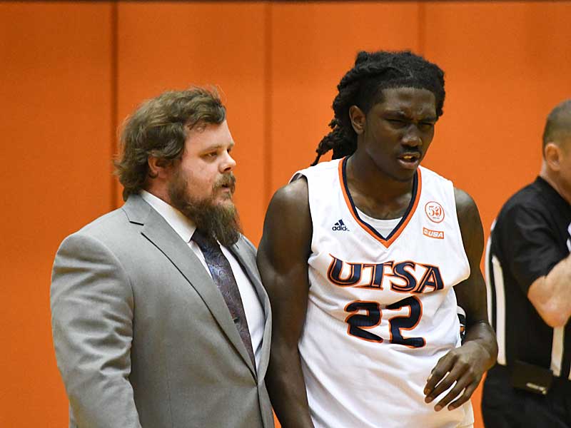 UTSA’s Keaton Wallace left the game late Thursday against Marshall after diving for a loose ball and hitting the ground hard. It appeared he might have hit one of the courtside chairs. – photo by Joe Alexander