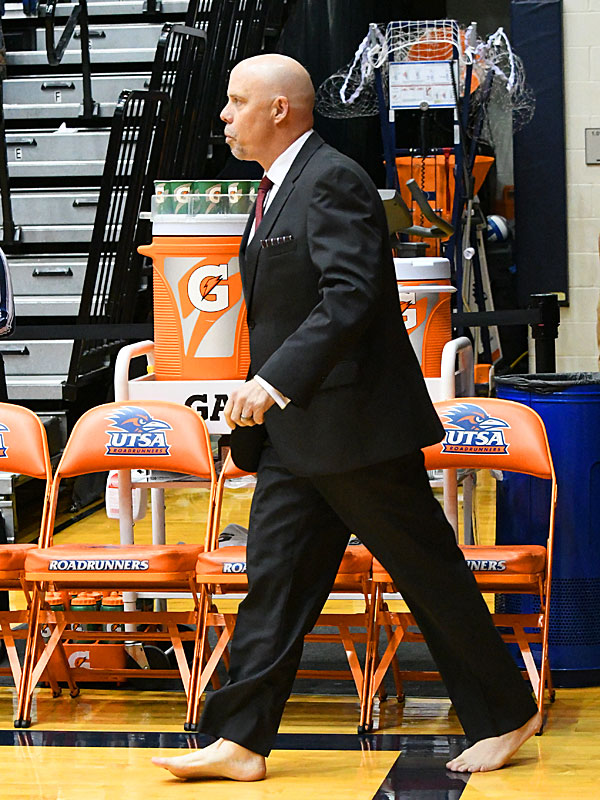 Steve Henson coached bare-footed in support of the charity Samaritan’s Feet in UTSA’s 66-59 Conference USA bonus play victory over UAB on Sunday at the UTSA Convocation Center. – photo by Joe Alexander