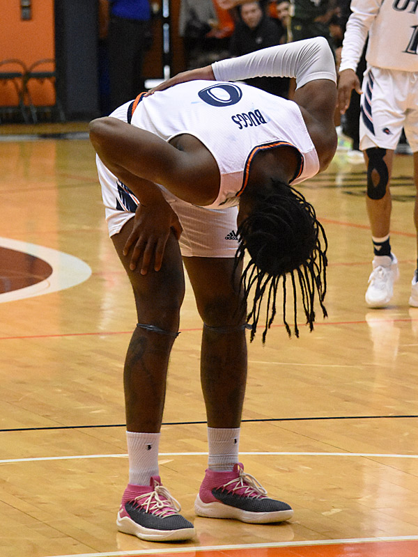 John Buggs bends over after landing hard on his rear end with 12:16 to play. He exited the floor for treatment and then returned to finish with 14 points- Photo by Joe Alexander