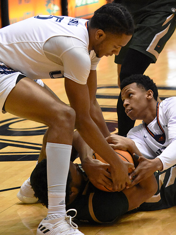DJ Richards and Japhet Medor. UTSA lost to UAB 83-78 in Conference USA men’s basketball on Saturday, Feb. 18, 2023, at the Convocation Center. – Photo by Joe Alexander