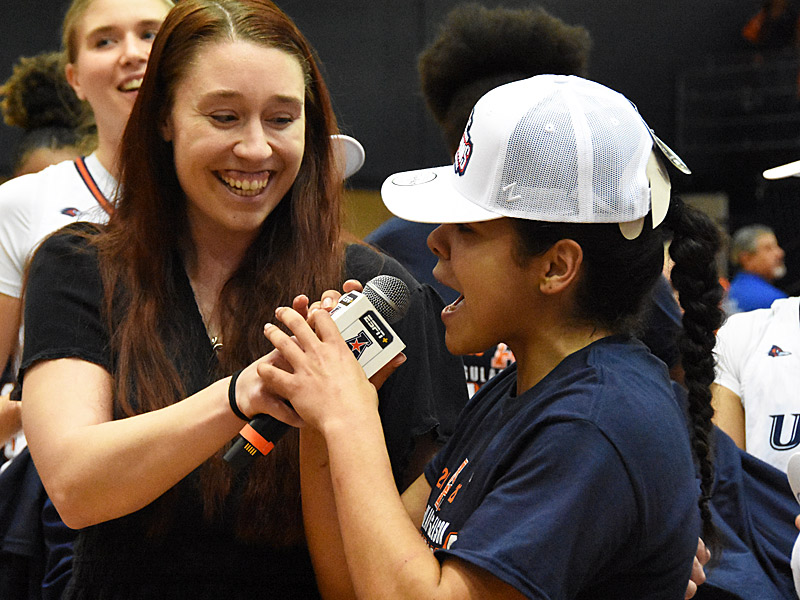UTSA point guard Nina De Leon Negron (right) had a few things to say to broadcaster Carlie Heineman after the Roadrunners clinched the AAC regular-season title. – Photo by Joe Alexander