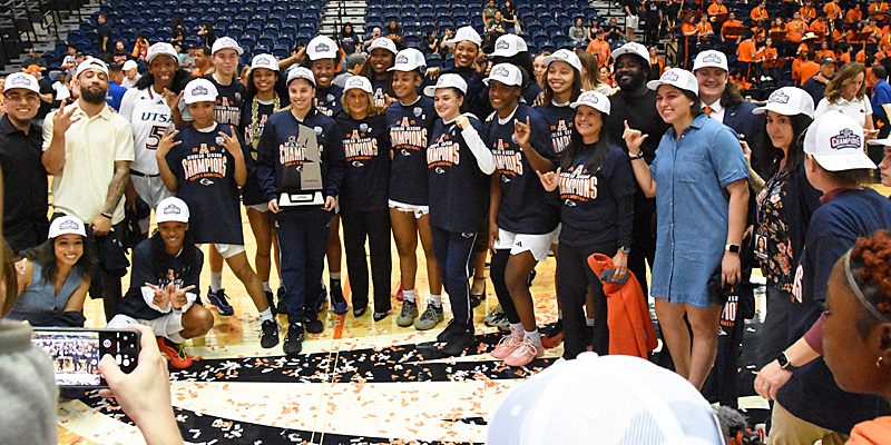 UTSA-BKW-celebration-20250301-3825 Published March 1, 2025 at 800 × 400 in UTSA celebrates women’s basketball regular-season title: photo gallery UTSA The UTSA women’s basketball teams celebrates at the Convocation Center after winning the 2024-25 American Athletic Conference regular-season title on Saturday, March 1, 2025. – Photo by Joe Alexander