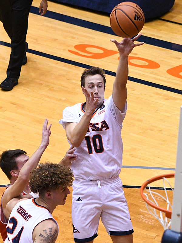 UTSA guard Erik Czumbel, playing against Sul Ross on Dec. 4, 2020, at the Convocation Center, started two of UTSA’s first six games of the season and averages 7.2 points. – photo by Joe Alexander
