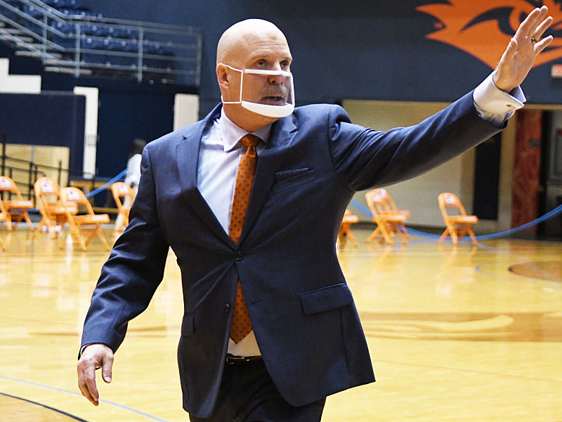 UTSA coach Steve Henson salutes the fans after the Roadrunners’ 77-69 victory over North Texas on Saturday, Jan. 9, 2021 at the Convocation Center. – photo by Joe Alexander
