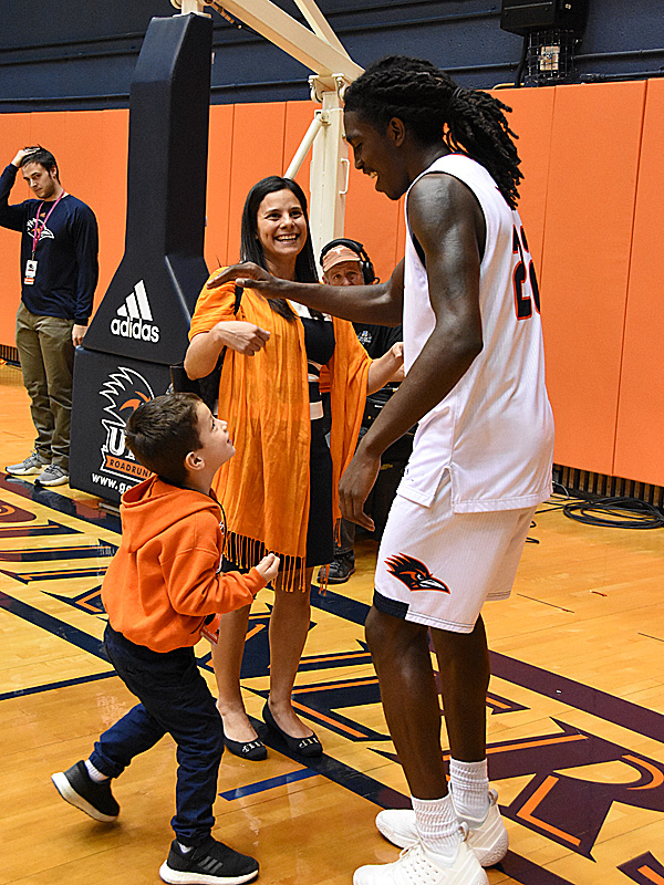 Keaton Wallace celebrates with UTSA athletic director Lisa Campos after the Roadrunners’ come-from-behind 74-73 victory over Old Dominion on Saturday at the UTSA Convocation Center. – photo by Joe Alexander