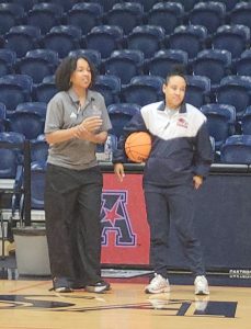 Prairie View A&M head coach Tai Dillard (left) visits with UTSA assistant Amber Gregg Saturday at the Convocation Center. Dillard worked on the coaching staff and Gregg played for UTSA teams that reached the NCAA tournament in 2008 and 2009. – Photo by Jerry Briggs