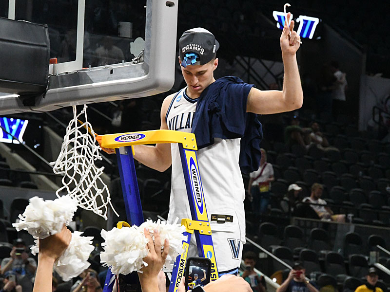 Villanova’s Collin Gillespie takes a turn cutting down the net after the game. Villanova beat Houston 50-44 in the NCAA tournament South Region on Saturday, March 26, 2022, at the AT&T Center to clinch a spot in the Final Four. – photo by Joe Alexander