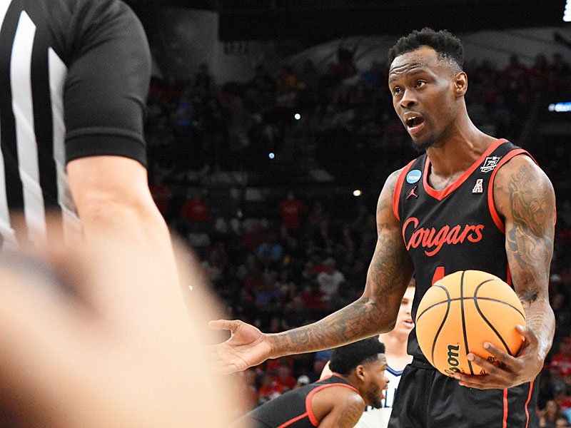 Houston’s Taze Moore questions a call during the second half. Villanova beat Houston 50-44 in the NCAA tournament South Region on Saturday, March 26, 2022, at the AT&T Center to clinch a spot in the Final Four. – photo by Joe Alexander