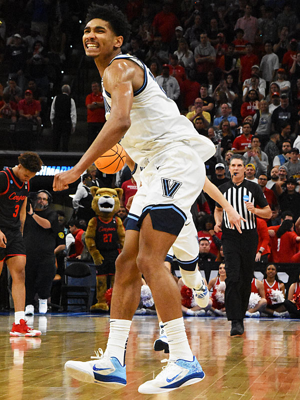 Villanova’s Jermain Samuels celebrates as time runs off the clock. Villanova beat Houston 50-44 in the NCAA tournament South Region on Saturday, March 26, 2022, at the AT&T Center to clinch a spot in the Final Four. – photo by Joe Alexander